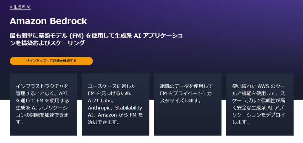 Amazon Bedrockは、Amazonの強大なクラウドサービス「AWS」の上に構築され、多種多様なAI機能を利用できる開発者向けのAIプラットフォームです。