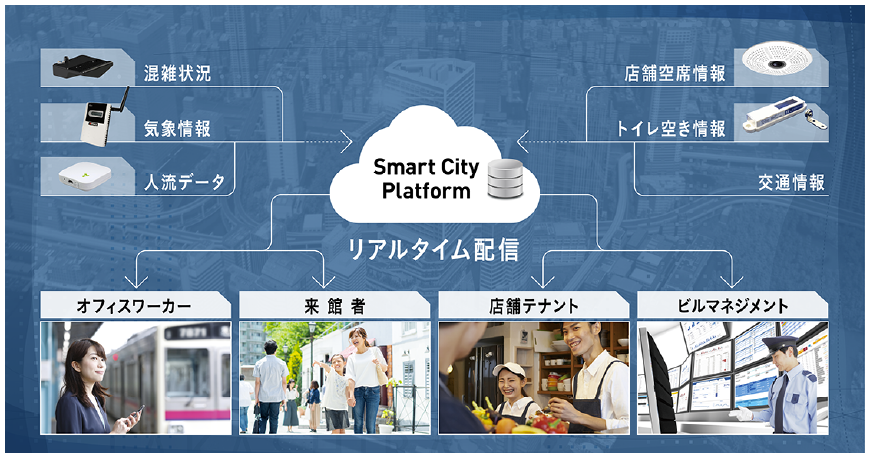 これらのデータは「スマートシティプラットフォーム」で収集・解析され、快適な環境整備と効率的なビル管理に活用され、人々の生活をスマートにすることを目指しています。