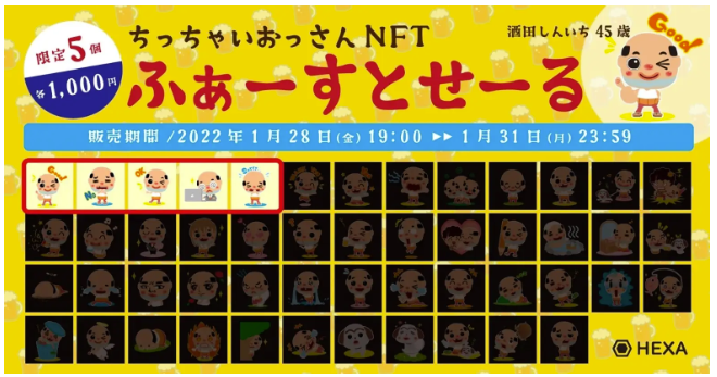 2022年1月28日、メディアエクイティ株式会社は、NFTマーケットプレイス「HEXA(ヘキサ)」にて、非公認のご当地キャラクター「ちっちゃいおっさん」のNFTデジタルアートコレクションを販売しました。