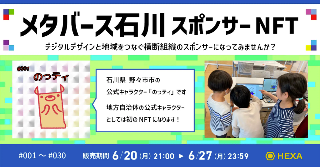メタバース石川という団体のスポンサーの権利を、公式キャラクターのイラストが描かれたNFTとして販売しています。