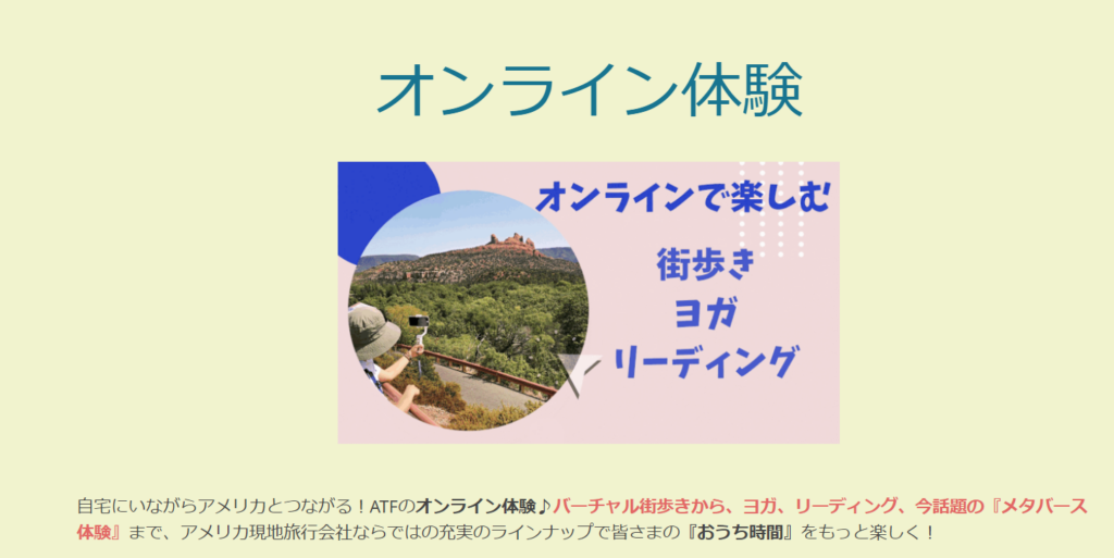 リアルタイムで、米国の観光名所を巡ることができるオンラインツアーや、オンラインヨガを体験することができます。