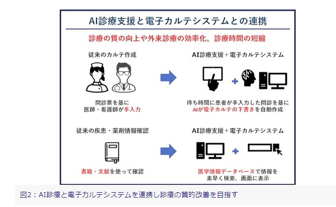 それぞれの患者の症状や所見、診断、治療に関するデータを電子カルテシステムに表示し、大量の医学情報のデータベースを基にAIを診療支援やカルテ作成、また外来診療の効率化や診療にかかる時間の短縮に用いることです。