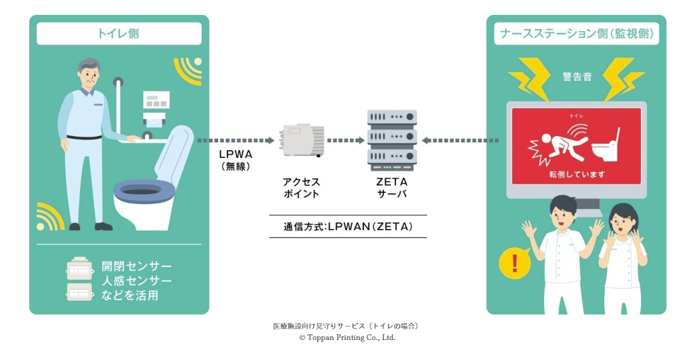 これは同社の低消費電力広域ネットワークのZETAを活用したもので、医療機関でも目が行き届きにくいトイレやシャワー室などでの緊急時の異常検知を自動で行います。