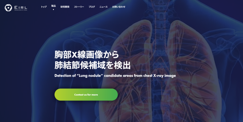 エルピクセル株式会社は、AIを用いた画像診断システム「EIRL」を開発していますが、その中の「EIRL Chest Nodule」は、胸部のX線画像から病気の疑いのある領域を候補として検出することで、従来は医師が人手で行っていた画像診断を支援します。