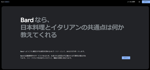 Bard公式サイトを開き、「ログイン」をクリック。自分のアカウントでログインしましょう。