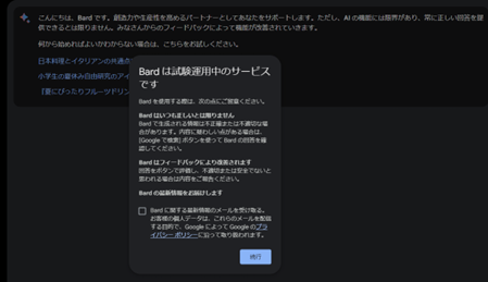 すると「Bardが試験運用中のサービスであるため、必ずしも正しいとは限らない」という但し書きがポップアップ表示されます。