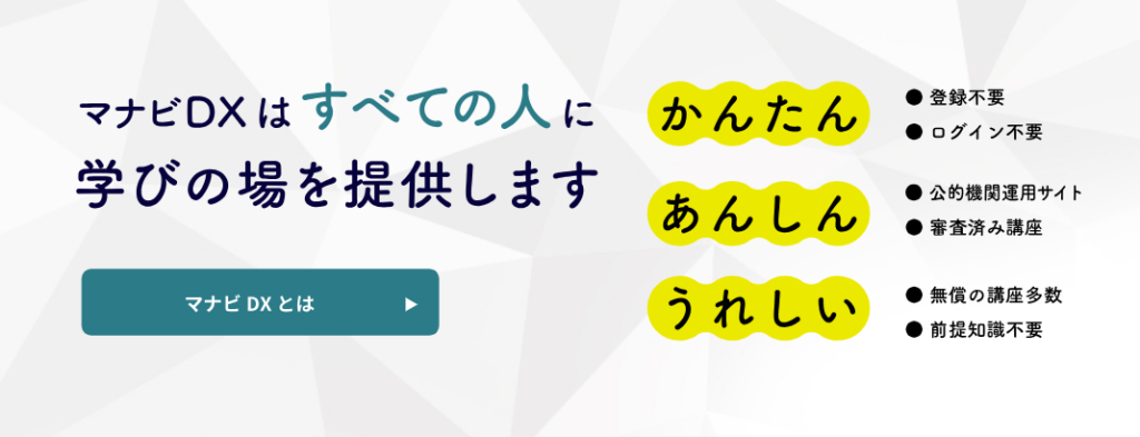 経済産業省では、DX人材の育成に向けたポータルサイトである「マナビDX」が開設されています。