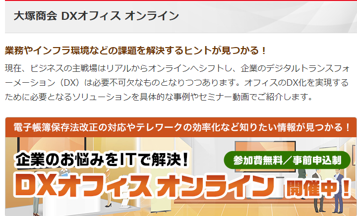 大塚紹介本社に設置したDXオフィスをツアー形式で案内してくれる「DXオフィス オンライン」では、DXの本質や目的、具体的な取り組み事例を理解することができます。