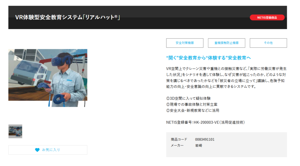 取り扱う「リアルハット」などのシステムは、NETIS(新技術情報提供システム)にも登録されており、バックホウの接触事故やクレーン作業中の災害といった重機関連のコンテンツが非常に充実しているのが特徴です。