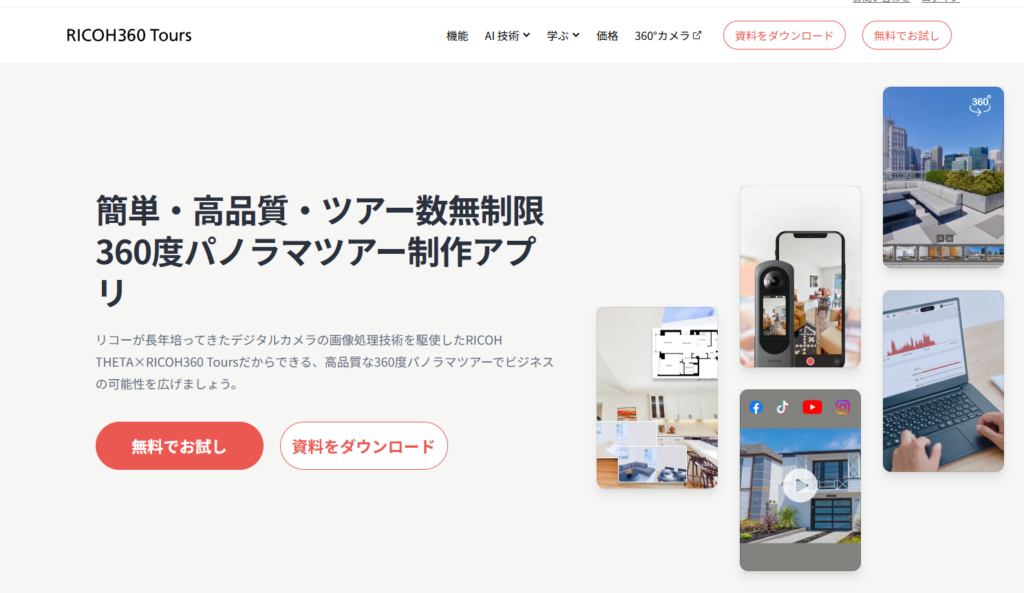 株式会社リコーが提供する「RICOH360 Tours」は、リコー独自のデジタルカメラ技術を駆使した高品質な360度パノラマツアー作成サービスです。